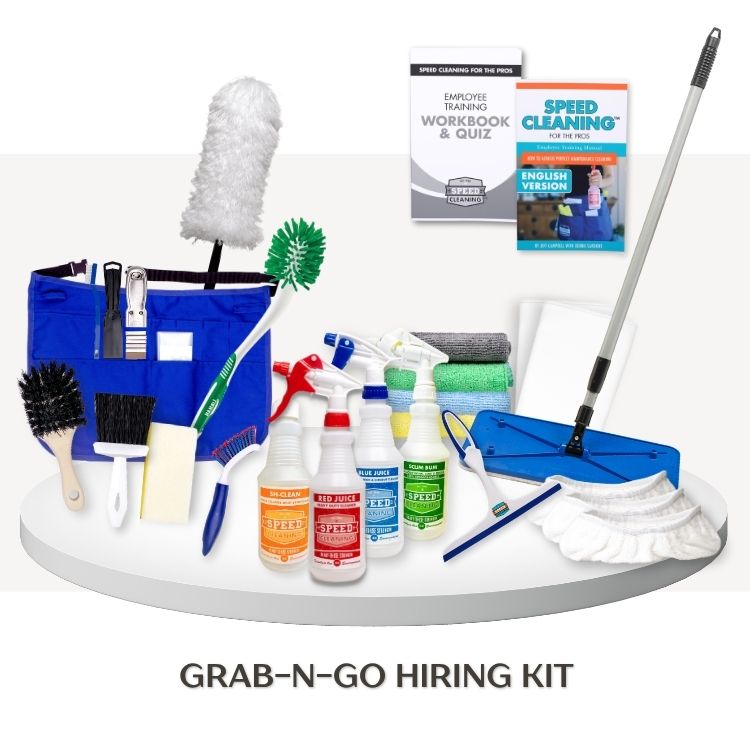 Speed Cleaning Hiring Kits provide the fastest way to onboard new employees. It provides the essential tools that new employees need to start cleaning. Take the hassle and time out of bringing new employees into your business with this special bundle!