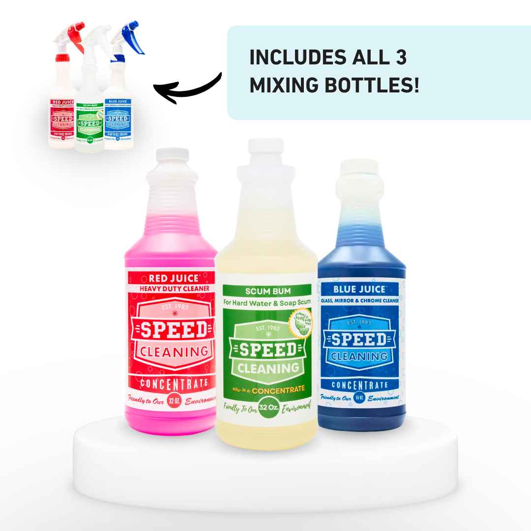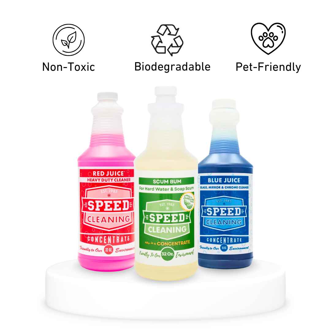 This essential house cleaning trio combines three of the most trusted concentrates in the industry — Red Juice, Scum Bum, and Blue Juice — to deliver professional-grade results that redefine what “clean” really means.